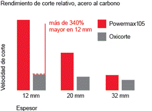 - Concluye los trabajos más rápido con velocidades de corte una y media veces mayores que las del oxicorte en acero al carbono de 12 mm (1/2 pulg.)